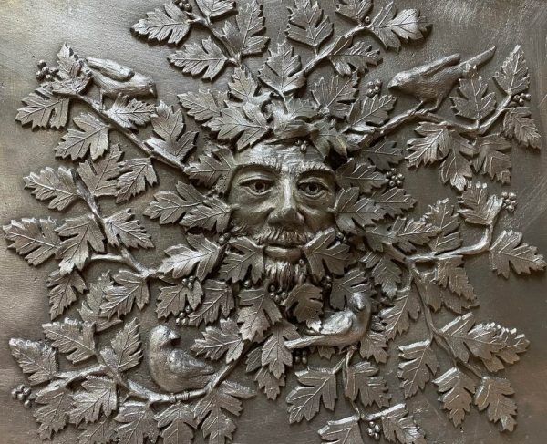 Modelled in bas-relief, St George, wearing a knight’s full armour, sits atop his rearing horse as he thrusts his lance into the mighty winged dragon below.