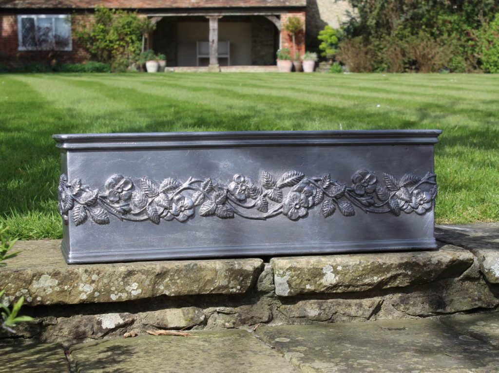 A beautiful example of our hand-crafted interpretation of the dog rose relief work originally used by the Bromsgrove Guild of Applied Arts has been applied here to another of the window boxes in our Bromsgrove range. However, with this solid lead window box being 50% longer than the smaller version listed, it provides space for even more of your favourite plants to flourish and for you to enjoy. This foundry-cast lead planter has been traditionally handmade in England by Heritage Lead Planters.