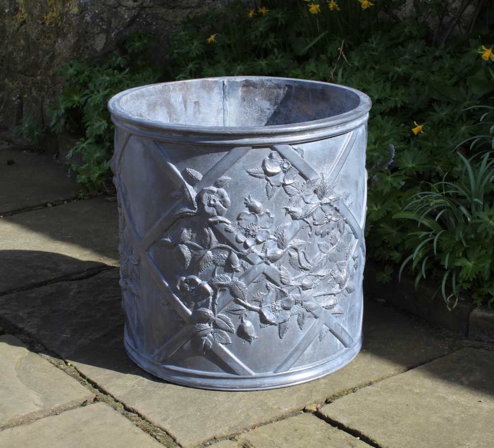 The embellishment of the dog rose in full bloom, its rose buds and leaves on this round lead planter is repeated three times, making it a delight to view from all angles. The runners of this rambling favourite weave through the diagonal trellis that wraps around the entire planter. Solid in construction, yet delicate in design, the Dog Roses Lead Planter would be a welcome addition to any garden. This foundry-cast solid lead planter has been traditionally handmade in England by Heritage Lead Planters.