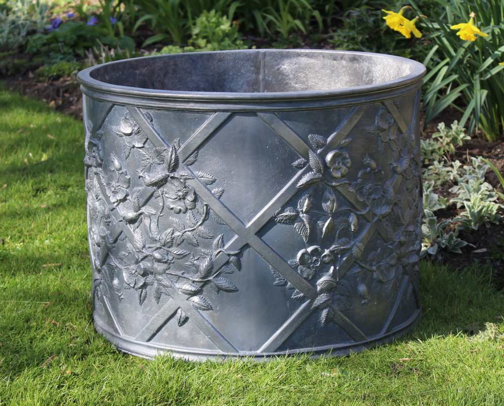 The elaborate design of the Dog Roses Round Lead Planter repeats itself on four panels that seamlessly wrap around the entire planter. Dog roses have been used in interior and exterior designs for centuries, seen here with their delicately layered petal formation, serrated leaves and fine stems winding through the impressive lead strapwork forming the diagonal trellis. This stunning solid lead planter would enrich any garden or conservatory, with or without the addition of plants. This foundry-cast solid lead planter has been traditionally handmade in England by Heritage Lead Planters.