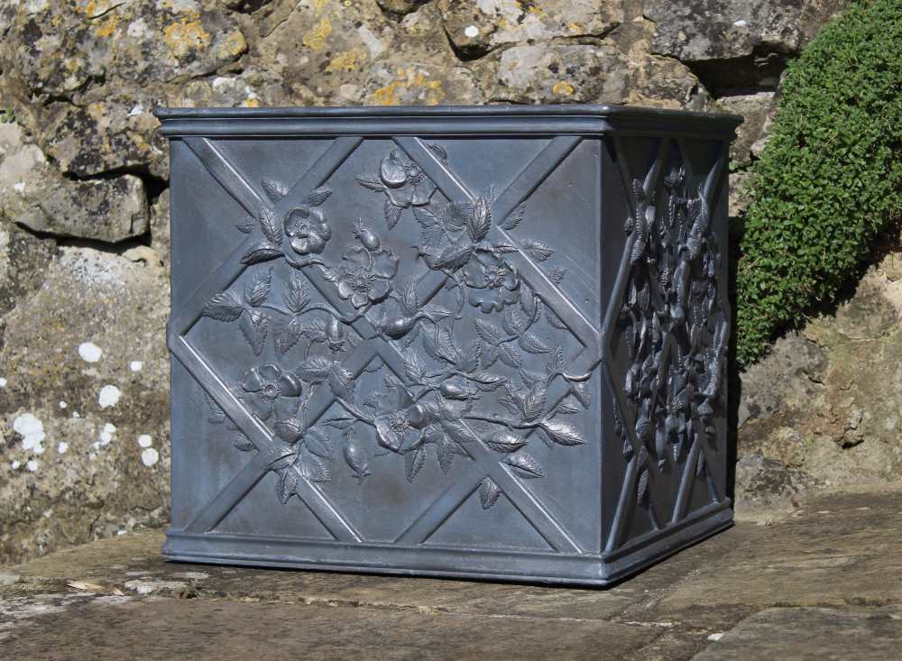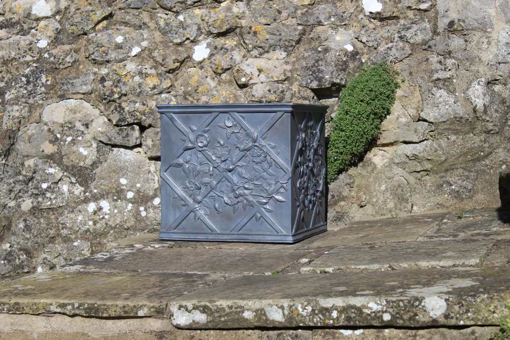 The highly decorative dog roses relief repeats itself on all four panels of this substantial lead planter. This embellishment looks equally impressive across our full range of Dog Roses planters and cisterns, with the sinuous vine trailing through a lead strapwork trellis, its delicate flowers open to the sun, and rosehips stand proud, ripe for the picking. It is sure to enrich any garden and be admired by all for years to come. This foundry-cast solid lead planter has been traditionally handmade in England by Heritage Lead Planters.