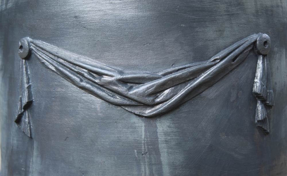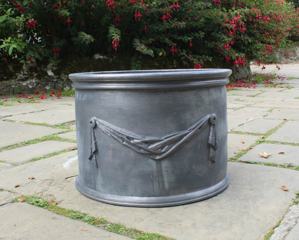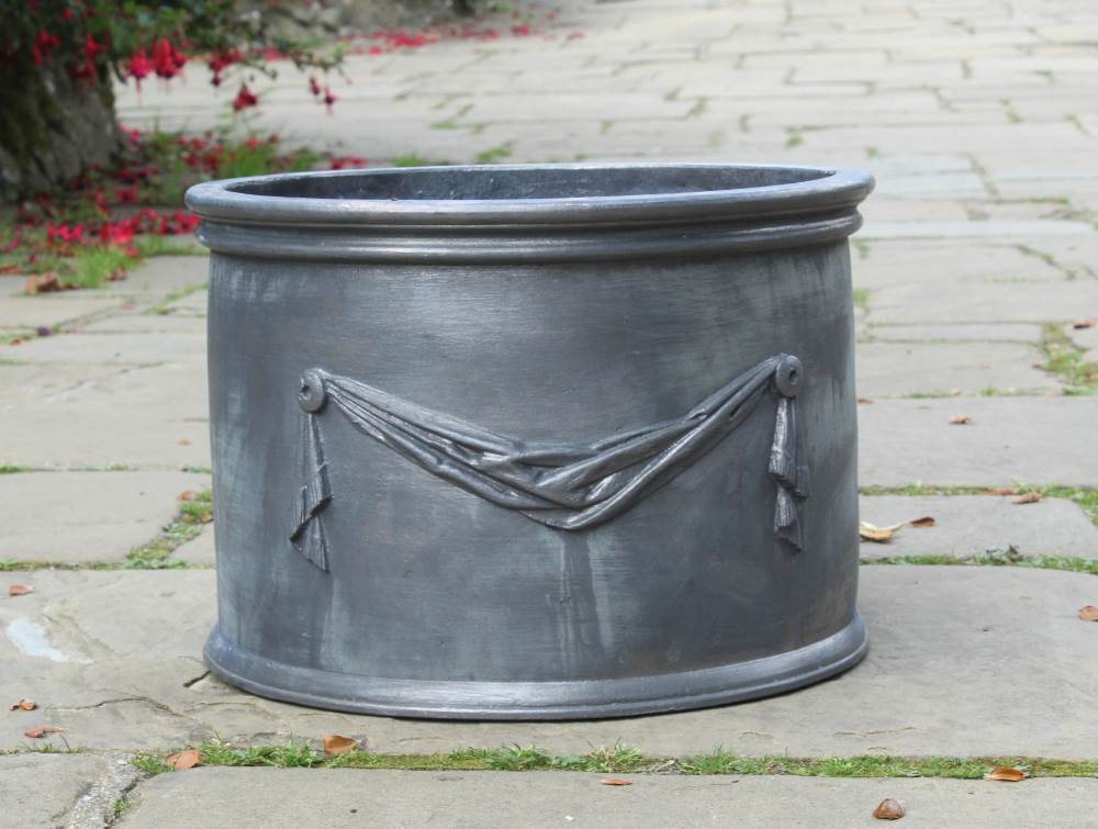 At first glance our Drapery Round Lead Planter might appear very simple; a valance of draped fabric held in place with two buttons. However, the historic significance of draped cloth is rich and emotionally charged. Terms such as ‘cloak of office’ and ‘mantle of leadership’ have existed for as long as people have been wrapping themselves in cloth. Draped cloth on a headstone reminds us of the veil that separates the living and the dead, a ‘memento mori’ and white cloth draped on a cross at Easter symbolizes the resurrection. Artist have always used drapery to display their bravura and skill and our real lead planter follows that tradition.