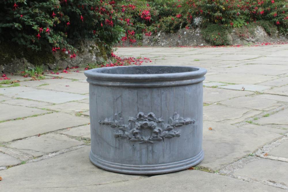 The Empire solid lead planter has a discreet design consisting of ribbon tied into a bow on a floral wreath flanked by sprigs of laurel. This makes a charmingly restrained planter that will show off your plants to their full beauty. Flowers and especially ribbons became synonymous with adornment and decoration, so artisans would replicate these embellishments in wood or metal to show off their skills, to lift their work from merely utilitarian and provide the owner with a visual feast. We hope to continue that tradition with our handmade lead planters.