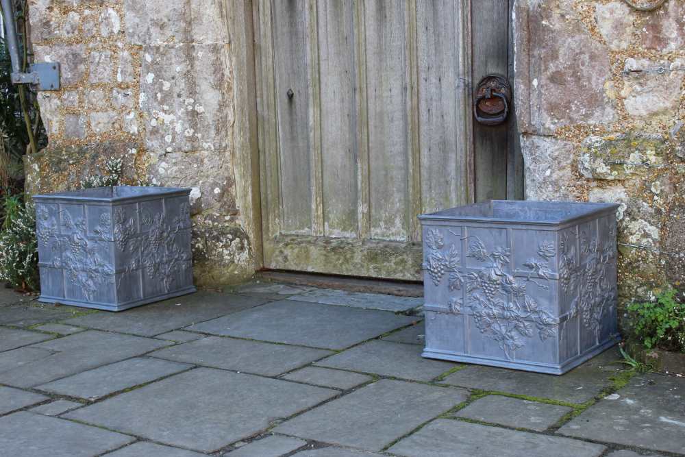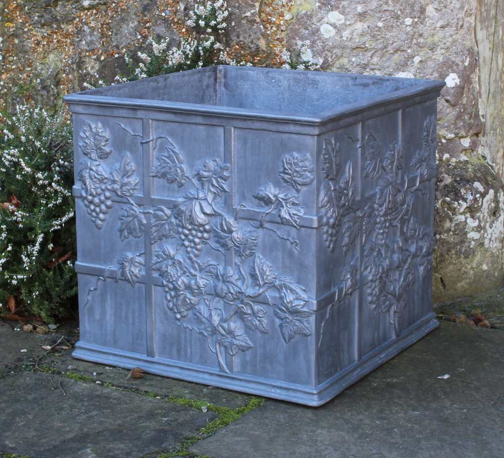 Our unique grapevine design is exemplified here on this square lead planter. The intricate detailing of veins on the leaves; the fine tendrils entwined around the strapwork trellis or sending out long shoots searching for somewhere to take a hold; the strength of the thickened vine base acting as an anchor, and the fullness of the ripened bunches of grapes all demonstrate the expertise of our craftsmen. Embellished on all four panels, our Grapevine Square Lead Planter looks stunning from any angle. This planter has been traditionally handmade in England by Heritage Lead Planters.