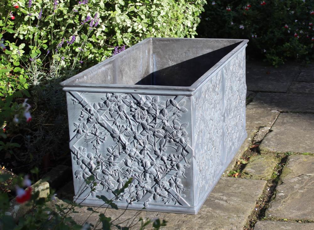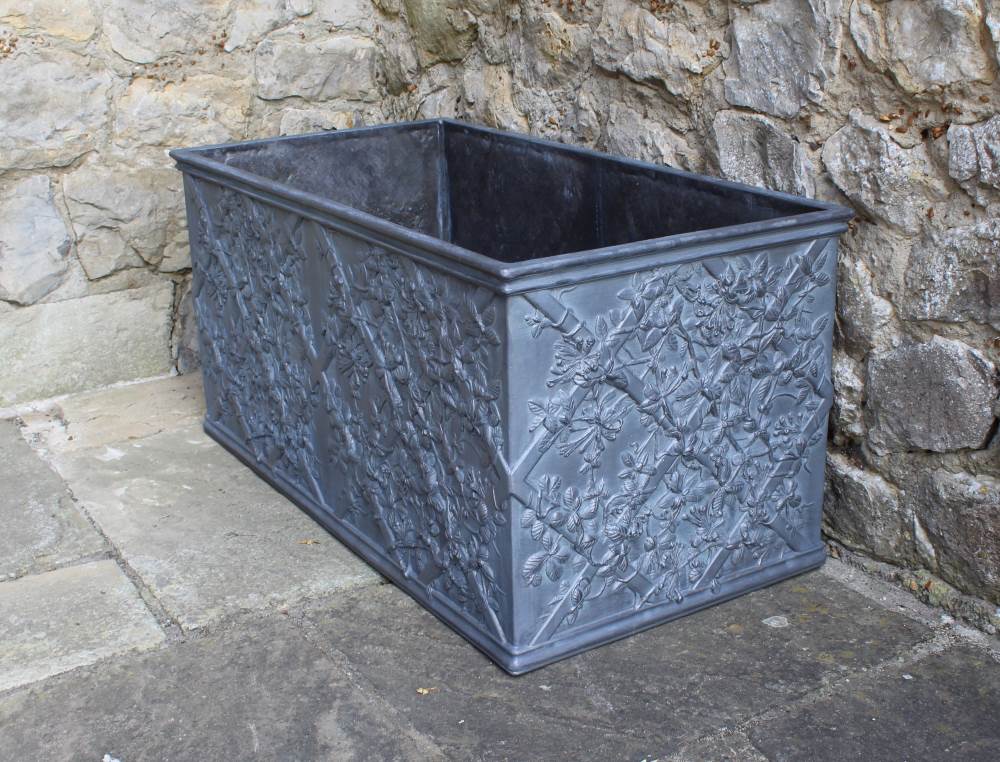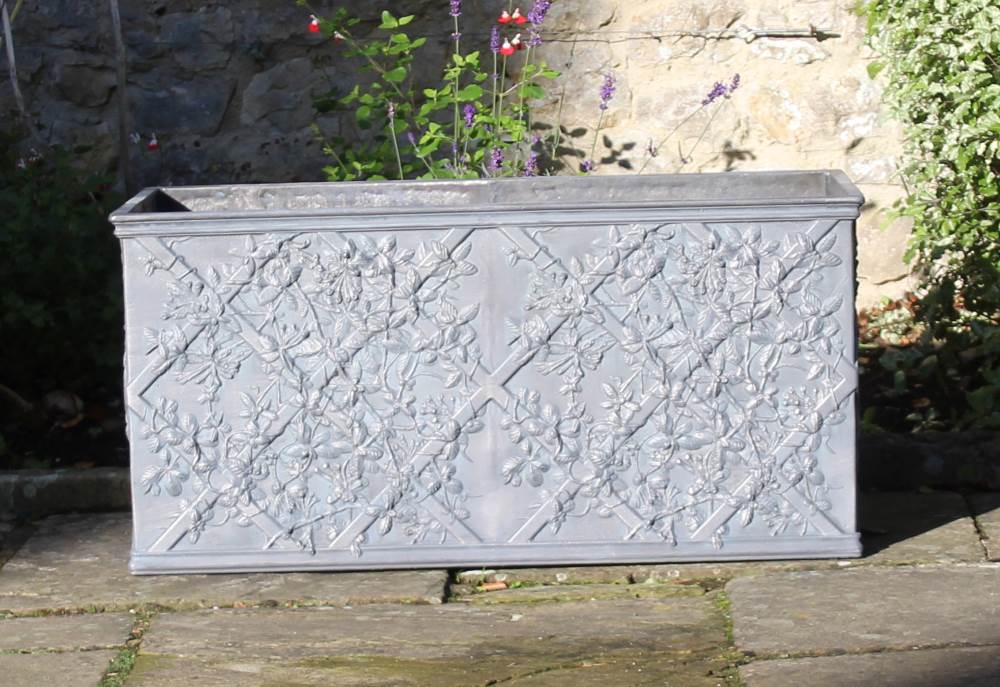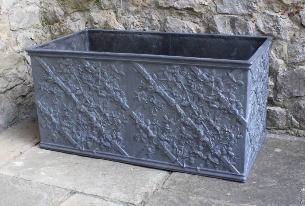Our beautiful cast-lead panels are used to make this gorgeous Honeysuckle Blossom Lead Cistern. The cistern is foundry cast in molten lead, before being hand finshed and patinated, making this magnificent planter a joy to own and use. A chaotic mass of hand-sculpted honeysuckle flowers grow uncontrolled around the entire surface, weaving through the pattern of supporting trellis. Substantial enough for a range of shrubs or your favourite bedding plants, this solid lead planter will provide years of trouble free service and has a beauty that will only improve with age.