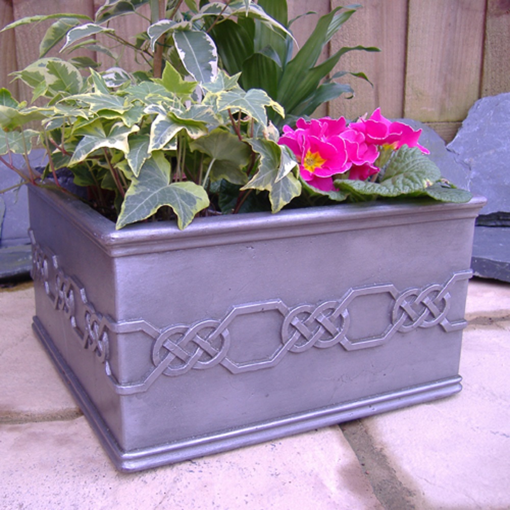 This square lead planter has a Celtic interlaced border. This type of work was practiced by the Pictish artist-craftsmen of the north of the British Isles. The Picts were the inhabitants of Scotland before the Scots, they ceased to be a separate tribe in about the tenth century. The wooden patterns for this lead planter were designed, and hand carved by Glyn Brawn. The panels were then cast in oiled sand, before being welded together and fettled. Finally the lead planter was given a coat of patination oil to seal the surface of the lead. This foundry-cast lead planter has been traditionally handmade in England by Heritage Lead Planters.